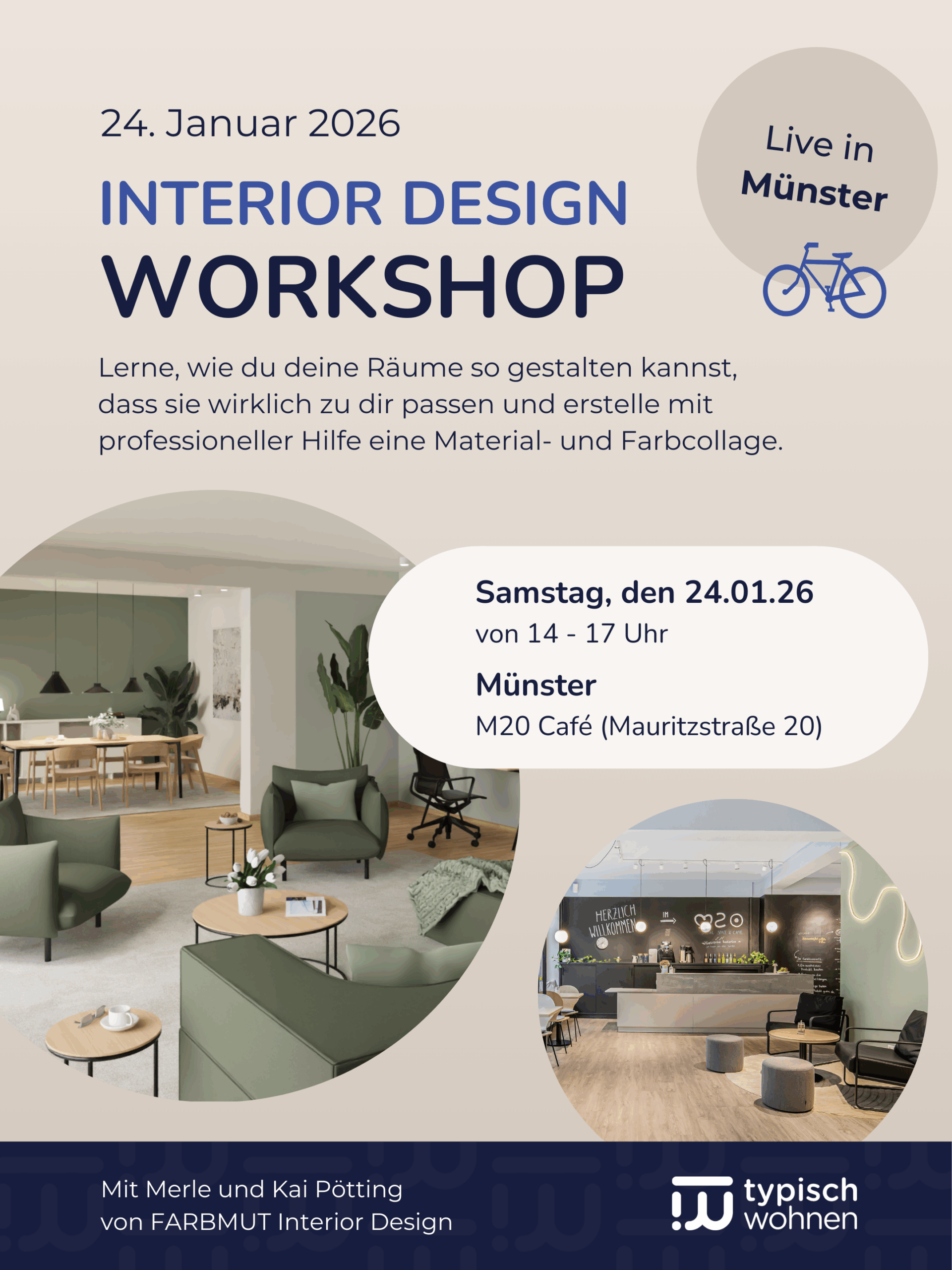 Den Workshop halten Merle und Kai Pötting. Mit ihrem Studio „FARBMUT Interior Design“ sind sie im Bereich der Innenarchitektur tätig und beschäftigen sich täglich mit der Gestaltung von Räumen.
